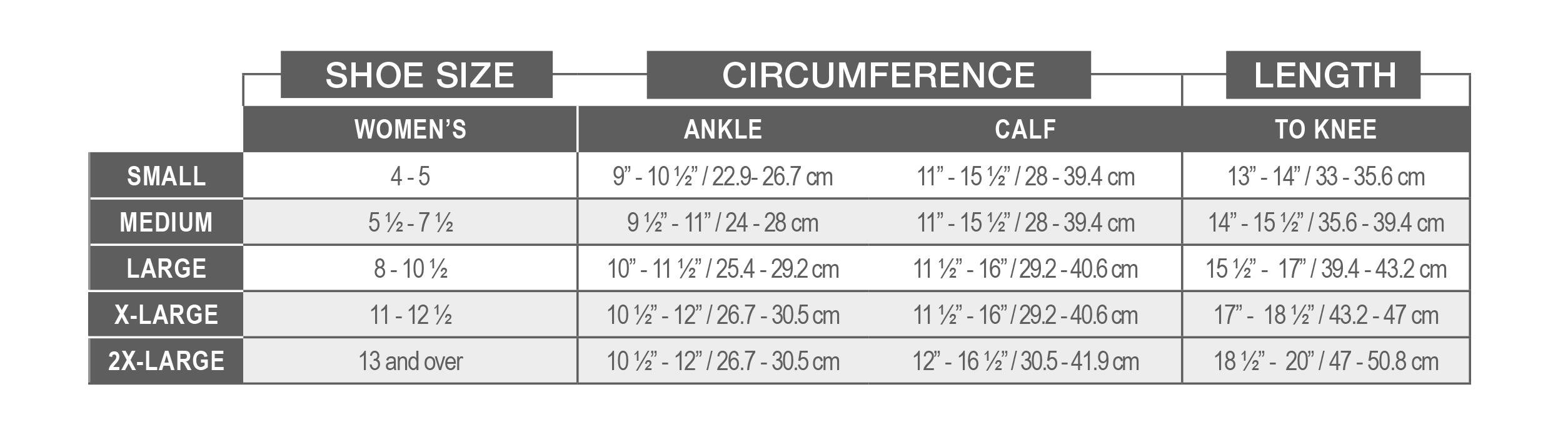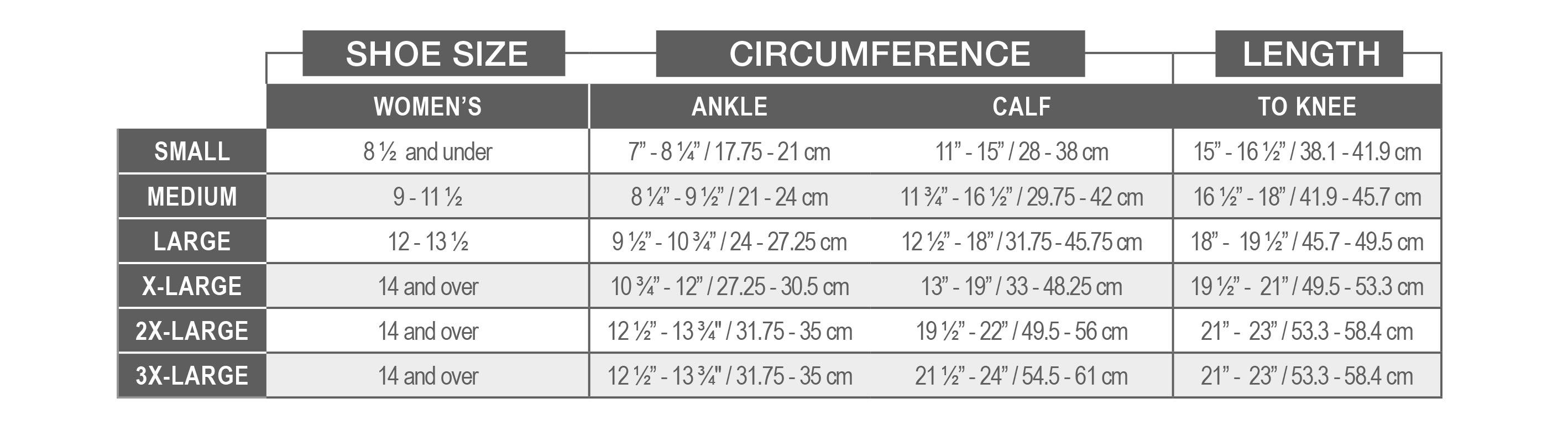 *Measurements must be taken by pulling the measuring tape snugly around the leg but without constricting the skin