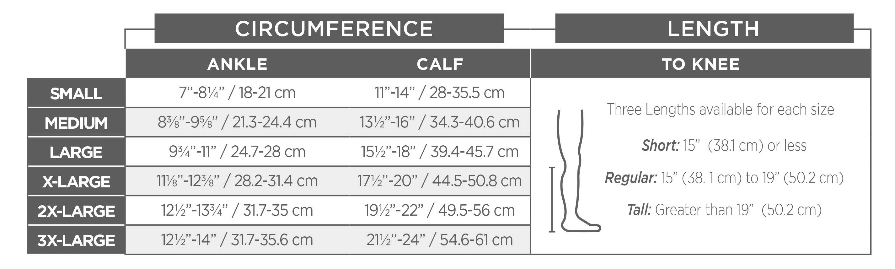 *Measurements must be taken by pulling the measuring tape snugly around the leg but without constricting the skin