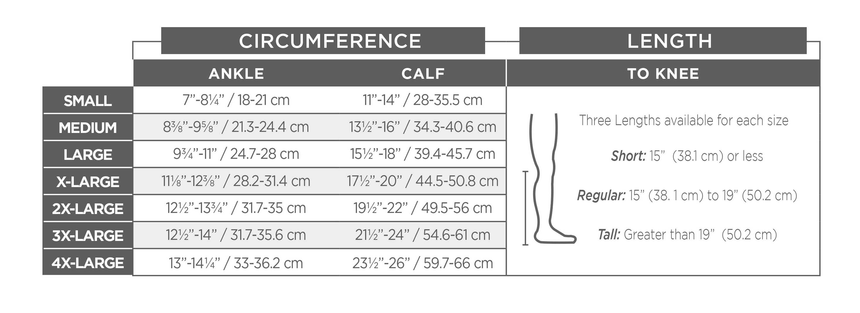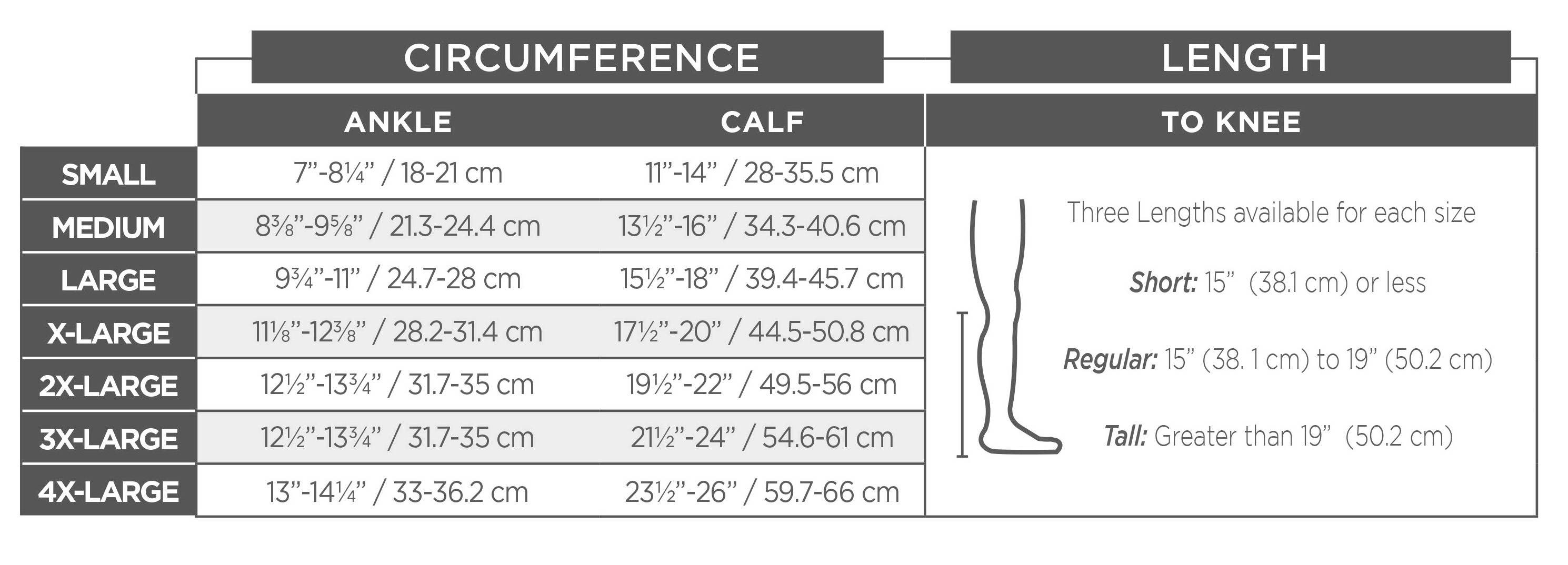 *Measurements must be taken by pulling the measuring tape snugly around the leg but without constricting the skin